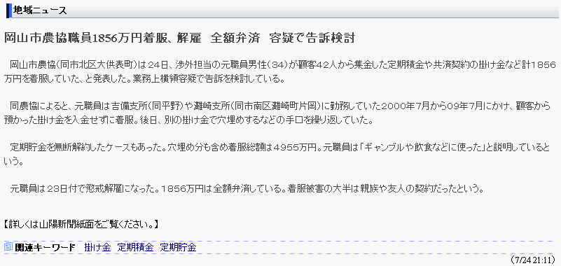 同農協によると、元職員は吉備支所(同平野)や灘崎支所(同市南区灘崎町片岡)に勤務していた2000年7月から09年7月にかけ、顧客から預かった掛け金を入金せずに着服。後日、別の掛け金で穴埋めするなどの手口を繰り返していた。