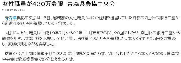 女性職員が430万着服 青森県農協中央会 2008.12.15 21:46