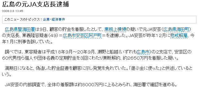 8000万横領で支店長解雇 広島のJA 2008.12.5 21:34