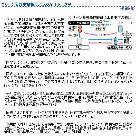グリーン長野農協職員、5000万円不正送金 8月9日(日)