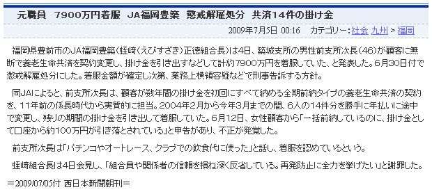 元職員 7900万円着服 JA福岡豊築 懲戒解雇処分 共済14件の掛け金 2009年7月5日 00:16 カテゴリー:社会 九州 > 福岡