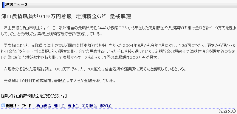 津山農協職員が919万円着服 定期積金など 懲戒解雇