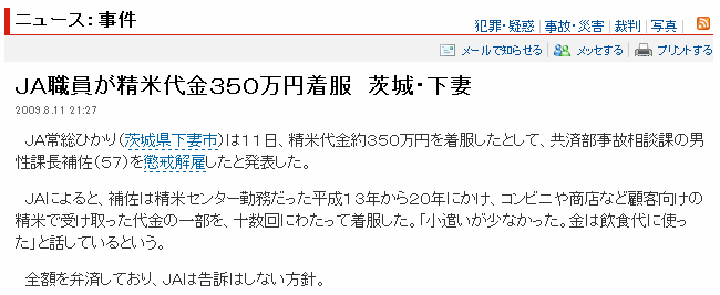 JA職員が精米代金350万円着服 茨城・下妻 2009.8.11 21:27