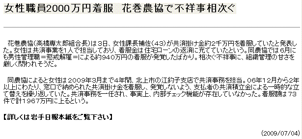 同農協によると女性は2009年3月まで4年間、北上市の江釣子支店で共済事務を担当。06年12月から2年以上にわたり、窓口で納められた共済掛け金を着服し、発覚しないよう、支払者の共済積立金による一時的な立て替えを繰り返していた。共済事務を一任され、事実上、内部チェック機能が存在していなかった。着服額は73件で計1967万円に上るという。
