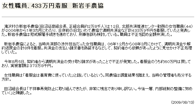 滝沢村の新岩手農協(田沼征彦組合長、正組合員約2万8千人)は12日、北部共済推進センター勤務の女性職員(44)が2006年から1年3カ月にわたり、合併前の旧北いわて農協で満期共済金など計433万9千円を着服していたと発表した。新岩手農協は懲戒解雇手続きを進めており、刑事告訴も検討している。職員は不正を認め全額弁済した。