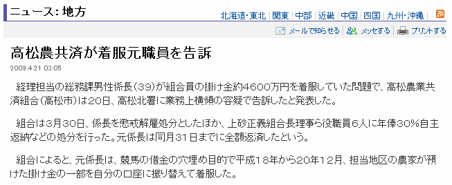 高松農共済が着服元職員を告訴 2009.4.21 03:05