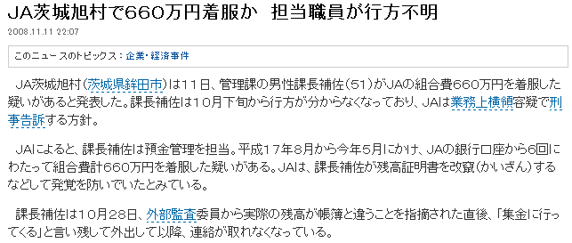 JA茨城旭村で660万円着服か 担当職員が行方不明 2008.11.11 22:07