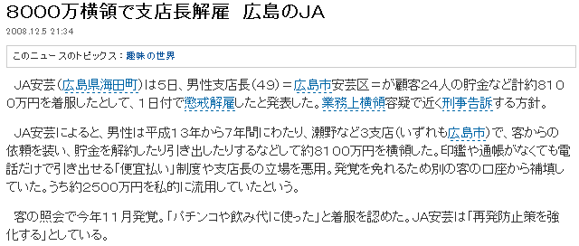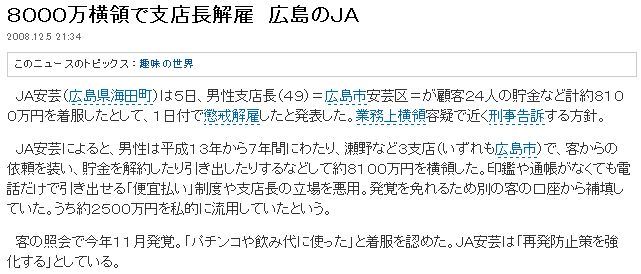 8000万横領で支店長解雇 広島のJA 2008.12.5 21:34