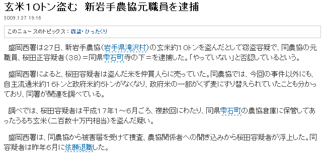 玄米10トン盗む 新岩手農協元職員を逮捕 2009.1.27 19:16