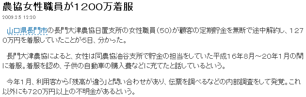 長門大津農協によると、女性は同農協油谷支所で貯金の担当をしていた平成16年8月~20年1月の間に着服。着服を認め、子供の自動車の購入費などに充てたと話しているという。