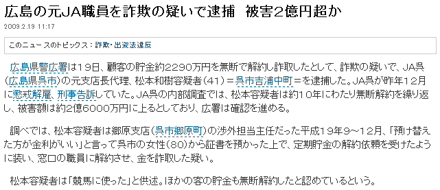 広島の元JA職員を詐欺の疑いで逮捕 被害2億円超か 2009.2.19 11:17