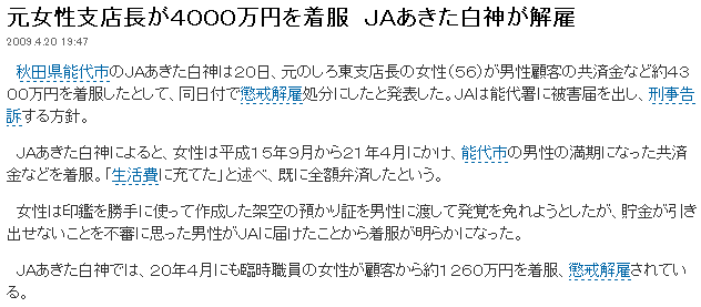 元女性支店長が4000万円を着服 JAあきた白神が解雇 2009.4.20 19:47