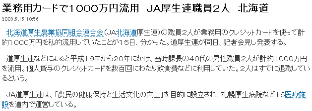業務用カードで1000万円流用 JA厚生連職員2人 北海道 2009.6.15 10:56