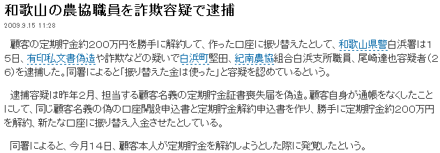 和歌山の農協職員を詐欺容疑で逮捕 2009.9.15 11:28