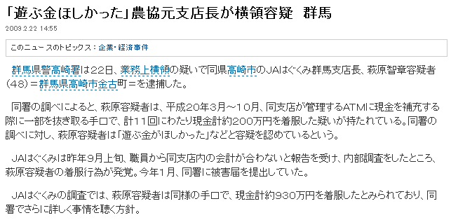 「遊ぶ金ほしかった」農協元支店長が横領容疑 群馬 2009.2.22 14:55