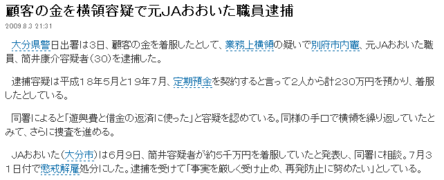 顧客の金を横領容疑で元JAおおいた職員逮捕 2009.8.3 21:31