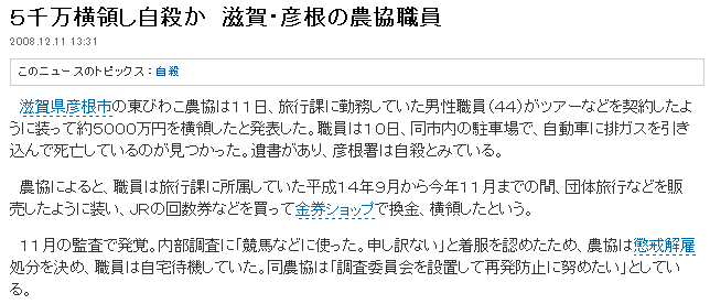 5千万横領し自殺か 滋賀・彦根の農協職員 2008.12.11 13:31