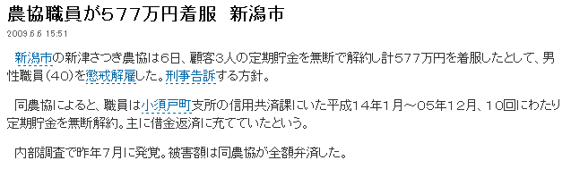 農協職員が577万円着服 新潟市 2009.6.6 15:51