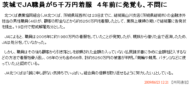 茨城でJA職員が5千万円着服 4年前に発覚も、不問に 2009/06/23 12:21   【共同通信】