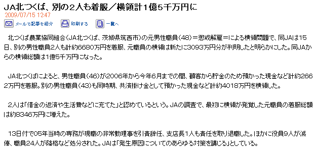 JA北つくば、別の2人も着服/横領計1億5千万円に 2009/07/15 12:47