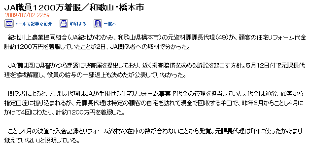 JA職員1200万着服/和歌山・橋本市 2009/07/02 22:59