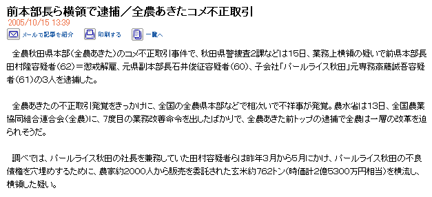前本部長ら横領で逮捕/全農あきたコメ不正取引 2005/10/15 13:39