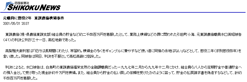 元職員に懲役2年 東讃農協横領事件 2001/05/31 20:37