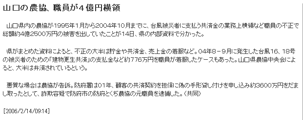 山口の農協、職員が4億円横領 [2006/2/14/09:14]