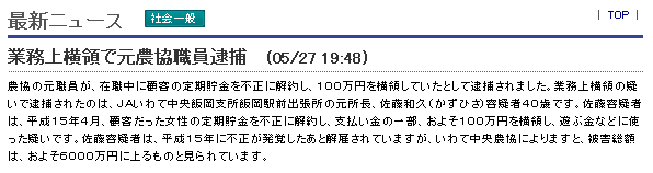 業務上横領で元農協職員逮捕 (05/27 19:48)