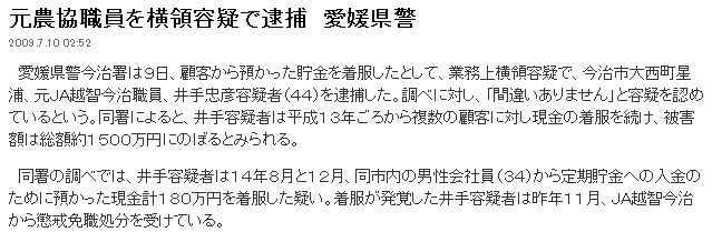 元農協職員を横領容疑で逮捕 愛媛県警 2009.7.10 02:52