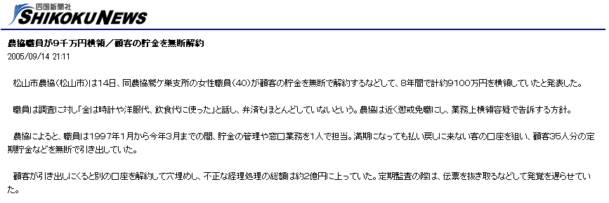 農協職員が9千万円横領/顧客の貯金を無断解約 2005/09/14 21:11