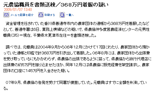 元農協職員を書類送検/368万円着服の疑い 2009/01/07 13:40