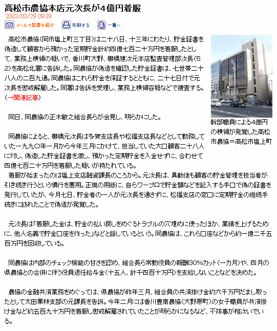 高松市農協本店元次長が4億円着服 2003/03/29 09:39