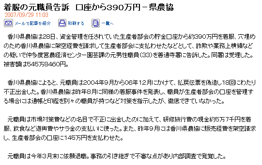 着服の元職員告訴 口座から390万円-県農協 2007/09/29 11:03