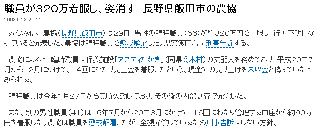 職員が320万着服し、姿消す 長野県飯田市の農協 2009.5.29 20:11