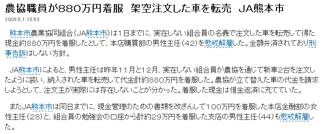 農協職員が880万円着服 架空注文した車を転売 JA熊本市 2009.5.1 16:59