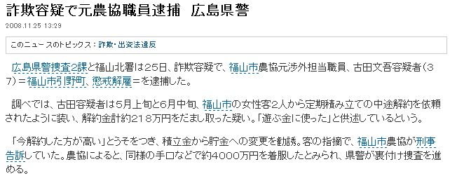 詐欺容疑で元農協職員逮捕 広島県警 2008.11.25 13:29