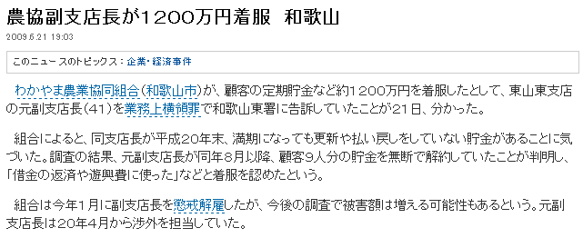農協副支店長が1200万円着服 和歌山 2009.6.21 19:03